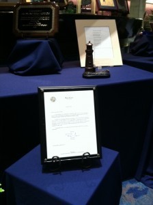 And here is a photo of that plaque next to a framed letter sent to the Hortons from Florida Governor Rick Scott—and which was on display Friday evening at the celebration: