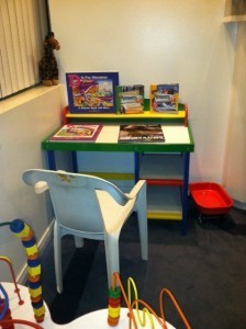 Dr. Flink sent us some photographs (see below) and explained: "I place the materials on the edge of my desk. The patient sits in the chair next to my desk. This is how I place the materials. I don't have a magazine or a book rack in my exam room."