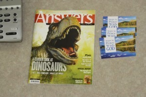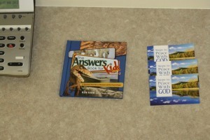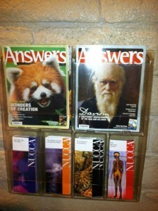 1. It is always refreshing to see the Word of God affect and transform people from all walks life. Recently, I received encouraging photos taken in the waiting room of Dr. Jack & Barbara Manuele (NUCCA Board Certified). Their family practice in the Los Angeles area treats spinal misalignments and more importantly the spiritual misalignment many patients have with God. You see, while visitors are waiting, children have the opportunity of knowing God as their Creator and Savior through Answers for Kids books, Dinosaurs for Kids, A is for Adam and other AiG materials. Also, adults get incredibly engaged with Answers magazines and our faith-defending Pocket Guides that help readers think and reflect over what they really believe in. But that's not all! During office visits, the Lord often allows Dr. Jack and Barbara to further equip those young in the faith and even minister to staunch atheists! In fact, just a few weeks ago, two particular well-to-do atheists accepted an invitation to see the Passion Play at the Manuele's home church. It is truly a remarkable to see how the Lord continues to reach the unreachable through the AiG family.