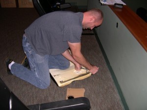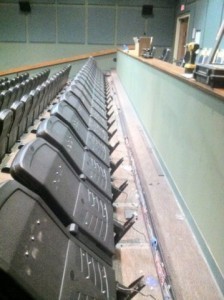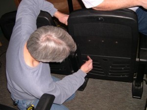 Each seat back cushion in the Theater had to come off to replace the shakers, to repair any water feed hoses, or to adjust or tighten the seat back frames. They have four large bolts and three small screws that hold the cushion to the frame. All of the four bolts suffered from problems that caused them to strip the threads, so that is why we had to drill the holes, tap the holes and replace all four bolts. This took approximately one to two hours to complete per seat. We did not just replace bolts but also drilled and tapped every hole—550 times!