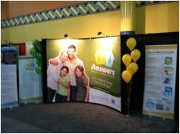 Part of the booth display. (There are sample lessons printed and available for attendees to take, plus a TV playing an informational video, and catalogs describing both Answers Bible Curriculum and our new VBS for this coming summer, IncrediWorld.)