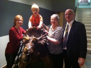 Here is a photo of Dr. Norman, his wife Claudia, daughter Laura, and grandson Sean when they were here on Thursday. Sean is sitting on top of our dinosaur model for kids, a photo op just outside the museum's exhibit halls.