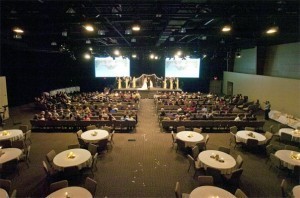Legacy Hall is used for conferences, movie nights, dramas, dinners—and now weddings!