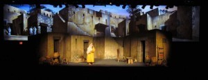 Cathy said, "Wouldn't it be cool if we made a set that blended into the screen so it is hard to tell where one segment ended and the other started?" I thought about it for a while, and just sat in the Legacy Hall trying to figure it out. I asked one of our artists to see if he could take the backdrop I had painted for the museum's SFX theater and see if the middle building could blend down into the stage since the screen is so high off the ground. He took a shot at it, but it looked flat. It was not his fault. The backdrop just didn't have enough depth. I decided to completely redo the projected backdrop and make it have more angles so that the lines of the set and backdrop pointed down to the actor. This allows one person to "fill" such a huge room.
