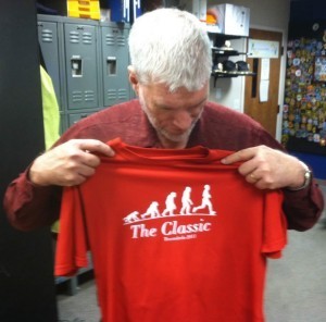 My friend Bryce in Minnesota sent me an interesting T-shirt recently. Bryce runs marathons around the United States; he's over the age of 50, but he still has some very good marathon times. An acquaintance of his in Belgium was the promoter for a race last month called "The Classic Tessenderlo" (named after the town in which it's run). In this photo, I'm holding the shirt that—I've been told—was given to all the runners after the race.