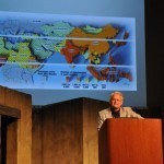 Bottom, right: A slide behind Dr. Crandall shows the so-called "Missionary 10/40 window," a region which has many nations largely unreached with the gospel.