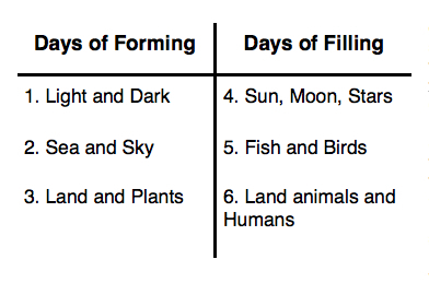 Take, for instance, the parallels that scholars have identified between days 1-3 and days 4-6 in Genesis 1, illustrated best by using a chart: