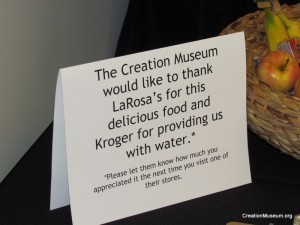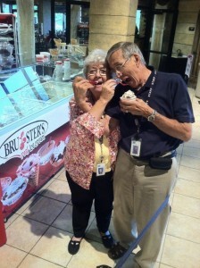 Lovebirds Jan and Bob Thompson are longtime Answers in Genesis volunteers who have been married 59 years. Yesterday was their wedding anniversary, and we honored them at our staff chapel. In the photo below, they enjoy sharing some Brusters ice cream (the butter pecan flavor) inside the Creation Museum: