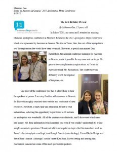 AiG was able to help a 13-year-old home schooler to be able to come to AiG's recent Apologetics Mega Conference. After the conference, her mother wrote the following email to one of our staff: