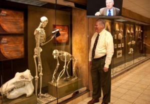 Second, along the wall of our Special Effects Theater at the museum we have unveiled our newest high-tech exhibit. In this photo, you can see me interviewing Dr. David Menton at our dedication ceremony. He is featured in a new "laser exhibit" on the science of "homology." It shows the major differences between humans and apes (and other creatures), using skeletons.