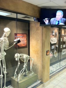 Rather than use a large number of signs and models that would take up a lot of exhibitspace, a video monitor has been installed on which people will be able to see one of the museum's eminent scientists, Dr. Menton, speaking on the topic of apes and humans. As Dr. Menton speaks on the video, he uses a laser to point at various parts of the skeletons found in the real glass cases below.