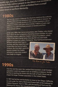 A close up of one of the history panels with an historic photograph. Over 30 years ago, founding board member (John Thallon) of the creation ministry (which began in our house in Australia) and I knelt down on a piece of property in Australia and prayed for a Creation Museum. The Lord answered that prayer 30 years later in Kentucky in 2007!