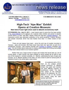 Laser beams seem to jump from the laser pointer of Dr. David Menton, as he appears on a special video monitor and points to specific exhibit areas in a new "Ape Man" display. The exhibit has opened at the world-renowned Creation Museum just outside Cincinnati, which has now hosted more than 1.3 million visitors in four years.