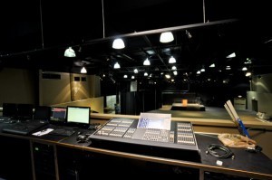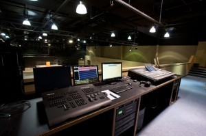 A view from the AV control area looking at the front of the auditorium/multi-purpose room