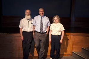 Now, back to 2011—Bill Daniels, the man who invited me to NASA in 1994 (and who was something of my "chauffeur" as I traveled in the area back then) visited the Creation Museum this week for the first time (with his wife Karen). We introduced them to the staff at our Thursday morning chapel. Afterwards, I had my photo taken with Bill and Karen. Bill and I heartily agreed that our beard color had changed a lot in 17 years!