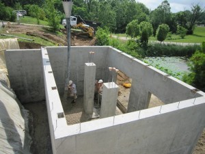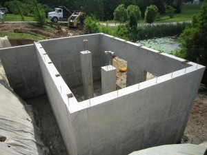 Our concrete contractor has dug the foundation and has poured the foundation walls and the basement floor. In the photo, you can see the isolated pillars for the large stationary telescopes that will be installed upon completion. Next, they will add the top floor, waterproof everything, and backfill with gravel and dirt. Then we will begin the framing process.