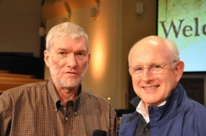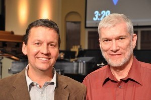 Here I am with Pastor Rhys Stenner of New Hope Baptist Church (with two locations) of Fayetteville, where Dr. Jason Lisle (shown in the pulpit) and I spoke this weekend: