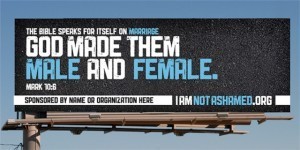 The billboard reads: "The Bible speaks for itself on marriage. God made them male and female – Mark 10:6."