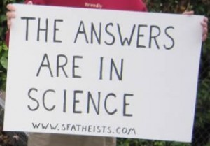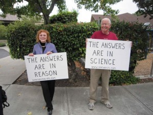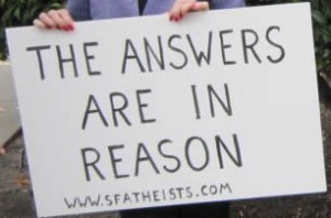 One of the signs reads, "THE ANSWERS ARE IN REASON."