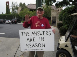 I went out and said hi. He was alone this time, and he greeted me in a friendly way. So I engaged him by inviting him into the church café for a coffee and donut—on me. He responded with something like, "I don't want to be preached at—why are you trying to convert me?" To which I replied, "but all I did was ask you in for a cup of coffee?" Then (in a blink of an eye his countenance changes dramatically) yells at me and says, "I DON'T WANT A G&*#! $&%#@ CUP OF COFFEE, AND I DON'T WANT TO BE CONVERTED," as he lifted the sign over his head and slammed it on his knee and then stormed off. He opened his car door threw the sign in, jumped in his car, and sped off. The mind boggling irony is the sign he is holding encouraging people to find answers in "reason."