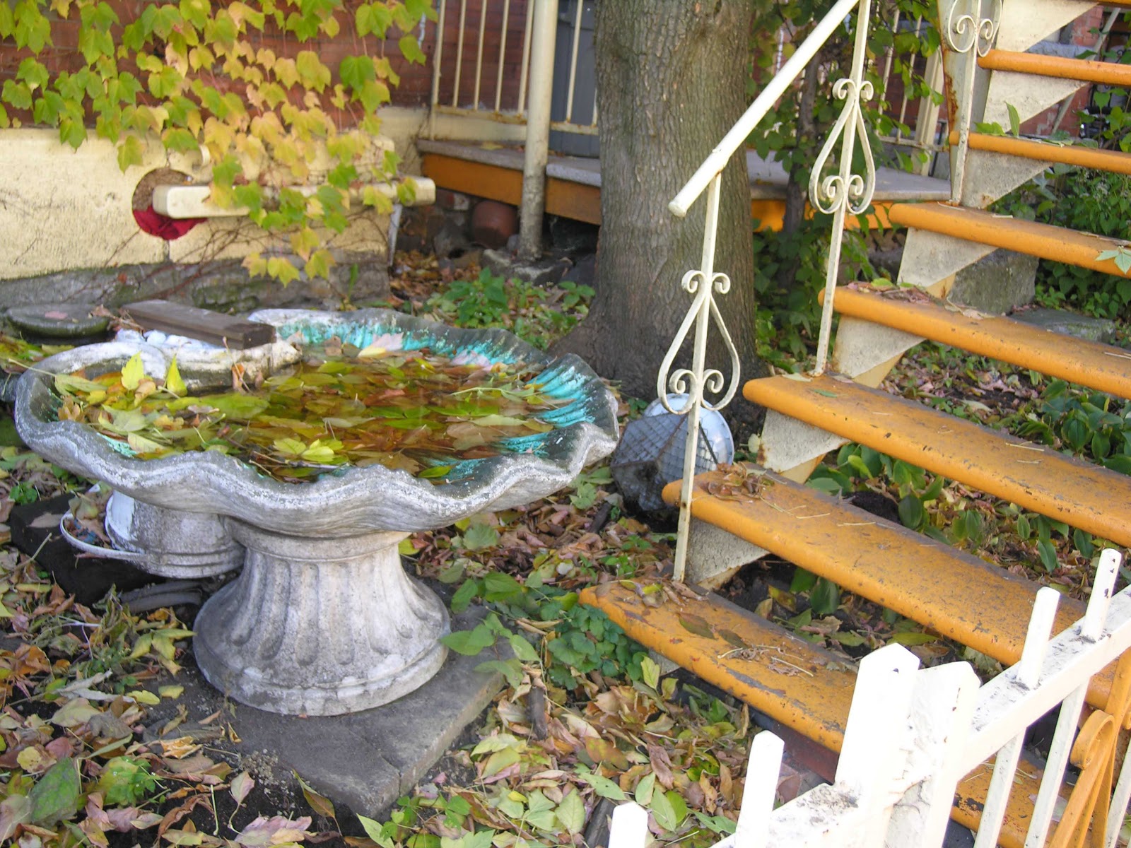 This time of year the trees surrounding the house are turning colour, and the flower beds are full of autumnal asters. But it hasn't turn so cold that the fountain has been turned off, so the splash of water competes with the traffic noises. [image error]