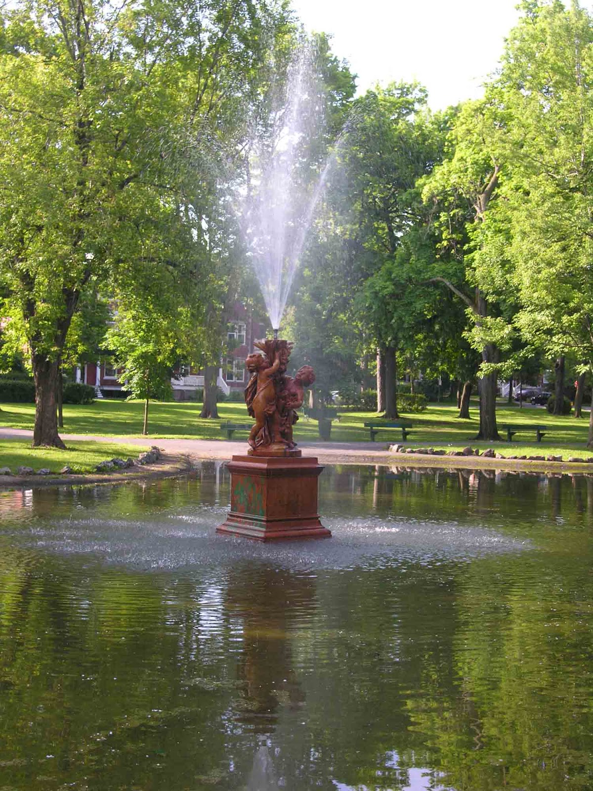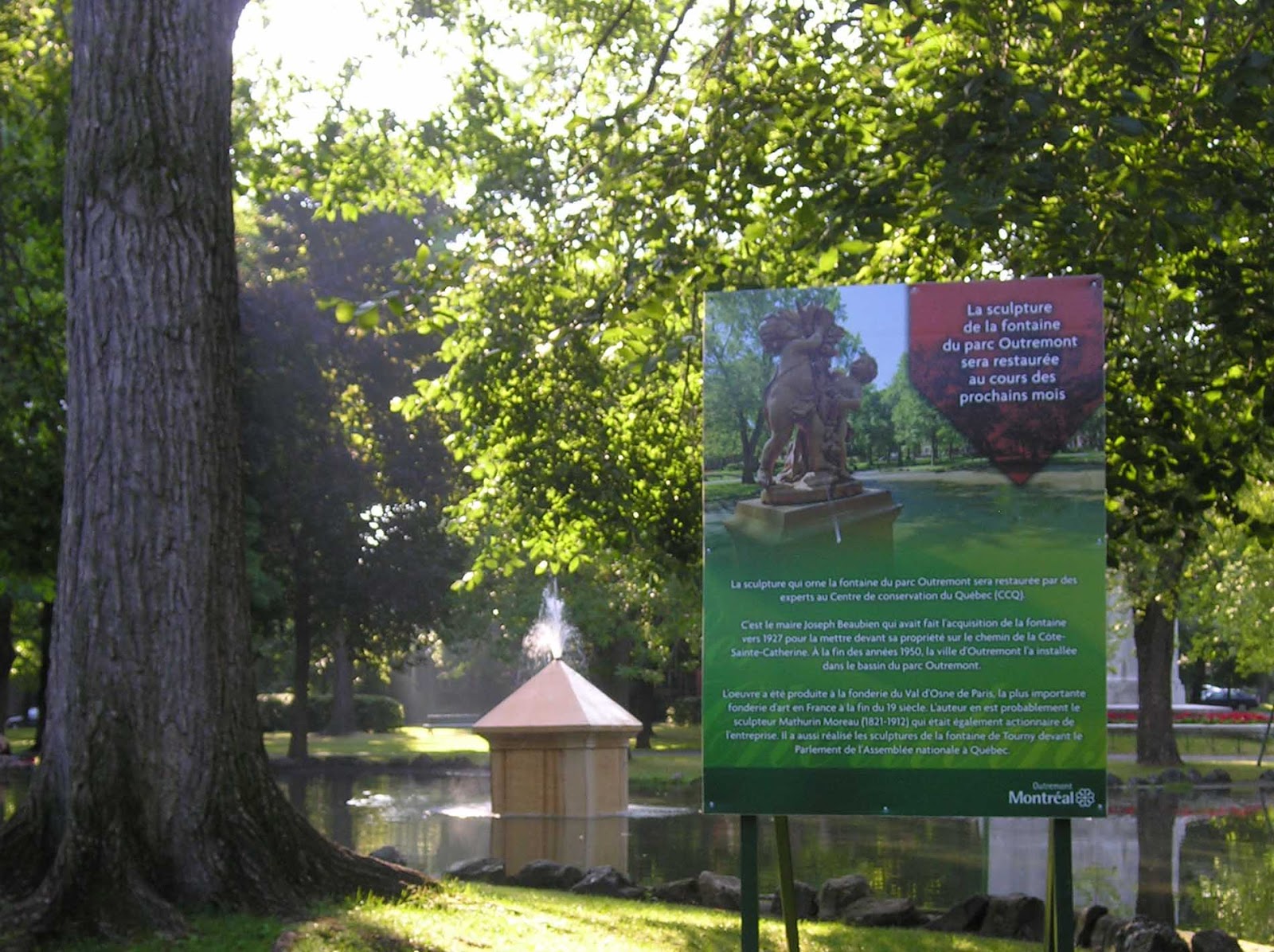 Parc Outremont is one of the lovely smallish green spaces in my neighborhood. In its center is a fountain which I had always thought was done by a Quebec sculptor, but which turns out to have been made in France toward the beginning of the 20th century.