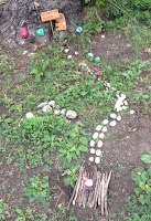 Last summer some kids near Parc Molson spent some happy time making a little scene in front of a tree in the strip of greenery between the sidewalk and the street. You'll see what it looked like below. Then came winter and snow and all that and I hadn't thought about the whimiscal setting until this week. That's when I was delight to see that they had recreated the scene, only this time with a bear coming out the door! Bravo, kids!