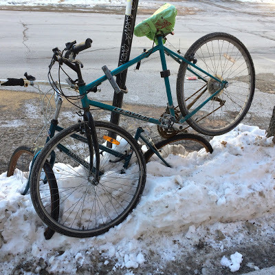 Here's a photo I took this morning on my walk (of course, walking is what our two legs were made for!) Obviously someone has things all set to go when the spirit moves her (or him.) The other, skelatal bike raises more questions. Left here certainly since before the snow got deep, and without its seat which suggests its owner wanted to make sure that it wasn't taken before it was wanted for use.