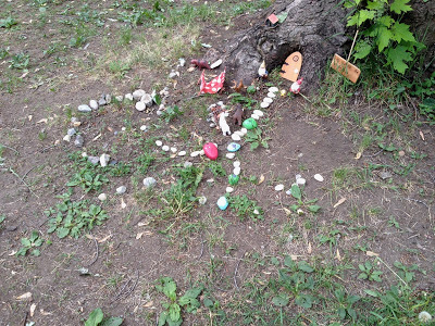 Some children on my granddaughter's street took things into their own hands, and built a little scene that they could control. Love this bit of whimsy in a world that isn't whimsical at all.