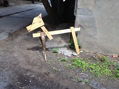 Because we all need a little whimsy these days, here's what I found in an alley not far from me. Couldn't do much carpentry on this saw horse, but kudos to whomever put it together. Creativity can blossom when times are tough...