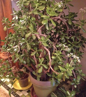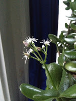 First let me say that I kill orchids, and can't get African violets to bloom. Don't know why, but after several years of trying, I'm faced with defeat on that front.However, I'm really proud of this jade plant which is now blooming very nicely, thank you very much. The trick, I discovered after quite a bit of research and reading between the lines is 1) letting it spend the summer in as much sun as possible and 2) bringing it inside when the temperature drops to near freezing.