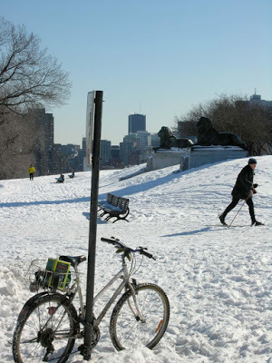 Nevertheless, winter bike riding is on the rise in Montreal. You need heavier bikes, and I'm told that studded tires (forbidden on cars) are useful, too. Don't think I'd take it up even if I were a better bike-rider than I am, but some of my nearest and dearest regularly bike to work all winter. Heroes--or foolhardy?