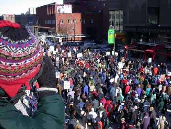 Must credit Jacques Sabourin for this photo taken February 15, 2003 when something like 200,000 people turned out in Montreal to protest again a war in Iraq.We were there, and I've never been prouder to be Canadian, because this march probably tipped the scales against Canadian involvement in that stupid affair. The march last September against climate change was bigger, but, let's face it, it's a lot harder to protest when your breath is freezing on your face.