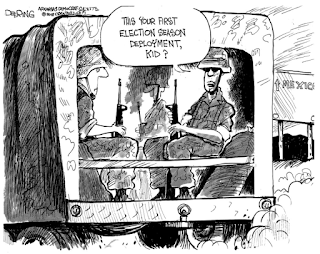 Unfortunately we may be back where we started. I've spent far too much of my life protesting war, yet if something is organized soon, count me in. The US strike that killed Qassem Soleimani was ill advised, making things a whole lot worse. Furthermore, reaction to it is going to sap energy that might be better expended in getting a Democrat elected to succeed Donald Trump as president of the US.Of course, that's part of the strategy you may be sure. Thanks to John Deering of the Arkansas Democrat-Gazette for the telling cartoon.
