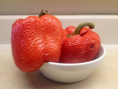But, you may ask, do these two photos have to do with that. The sleek and sensuous one is one by Edward Weston, taken in the fullness of his genius. The other is of two red peppers I baked not long ago in order to have roasted pimento for some dish I intended to cook. Both photos, I think, are quite lovely, but one represents youthful talent and joy and the other, what happens as we age.