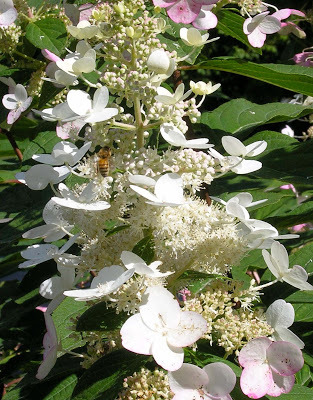 Don't know what kind of bee is visiting the hydrangea in the photo, but I find it very encouraging to see so many pollen-loving critters, no matter what kind they are.