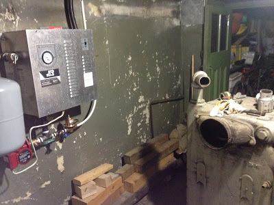 The cold weather is coming to this neck of the woods, climate change or not. Everyone knows you can't live here without having heating, and until now we've relied on a hot-water-heating fuel-oil furnace that probably dates from the conversion from coal in the 1950s. The rads all seem to be working fine, but the first time we turned on the heat two weeks ago, the boiler cracked and the system drained all the water.What a mess! How lucky we were that it hasn't been too cold because we have had no heat since then! Also good that a few years ago when we had to replace the oil tank we looked into switching over to electricity so we had some idea of what to look for. We didn't make the switch then, it didn't seem to be the moment.But the moment surely arrived this fall. It took two weeks but last Thursday a new electric furnace was installed. You can see the apparatus next to the remnants of the old boiler in the photo.