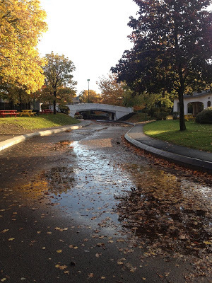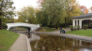 Not sure which way the causality ran, but the family (or families, not sure if there were two) of 11 ducks which spent the summer in neighborhood parks have flown off to warmer climes, and the water in the ponds where they hung out has been emptied.The lower photo shows what the pond looked like on Canadian Thanksgiving Day two weeks ago. The trees were still pretty green, and the human mother and son duo were sharing something to eat with the ducks. You'll notice that a few gulls have decided to join the party.