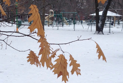 Snow on the ground, but not all the leaves off the trees. Is that perseverance, tenacity or stupidity?Don't but it does provide some relief from a nearly monchrome palette.