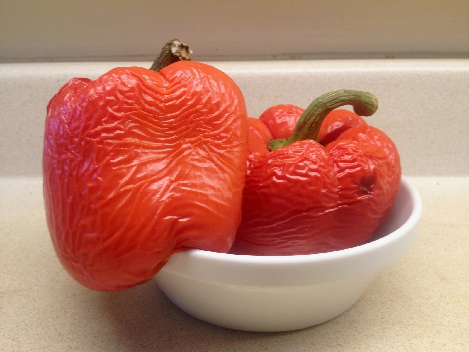 Be that as it may, I was delighted when two red peppers that I roasted in the oven in order to use them later as pimento in cooking turned out to look so much like Weston peppers that had aged. The slightly sagging bottom, the wrinkled skin, the age spots--I can relate to that these days. But beauty and pleasure is where you find it, one must remember...