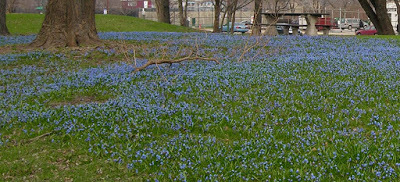 The photo actually is one I took several years ago in Chicago of scylla blooming in a park. But my front yard looks similar right now as the lovely little blue flowers--the second ones that bloom in my garden each spring--have made their appearance in force.
