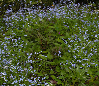 I don't believe in lawns, so the little one we have in our small backyard is strewn with many plants other than grass. Among them is mitosis or forget-me-nots which are in bloom extravagantly right now.Never forget how lovely they are...