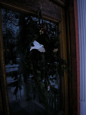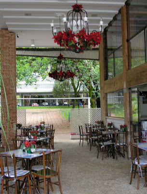 Another photo for three years ago: a cafe in Brasília which was all decked out in pointsettias and red ribbons for Christmas.We picked up our Christmas wreaths from Jeanne this morning: her school was selling them, and I bought two plus one for a neighbor. Quite nice.