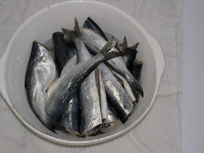These are salted herring, to be filleted and marinated to make sil, the Scandinavian pickled herring dish. It's something I've made every Christmas since I married into the Soderstrom family. Delicious!But this year I've been having trouble finding the fish. My usual fish store says they're sold out, and won't receive any more before January. I called around a bit, and found that National Herring, a wholesaler, has some at $6 a pound that they may sell me if I trek out to their warehouse. The price is much more than I've paid in the past, but for a holiday treat, I'll pay it.