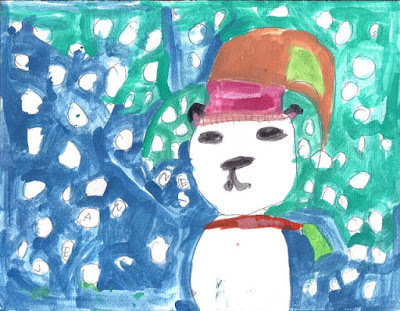 Such a nice thing to see little kids spread their wings and make interesting things. Jeanne was sick this week and stayed home, which gave her quite a bit of time, it seems, to draw and paint.This is a water colour she did of a snowcat with the snow falling, and her name written on some of the snowflakes. Quite delightful, says Grandma!