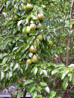 We may end up with more pears this year than the squirrels can eat! Last year we had perhaps a half dozen but this year there are lots. I've started picking the ones that look ripe-ish, trying to keep ahead of our bushy-tailed scavengers.I had feared that last year's dismal crop was due to an absence of bees to pollinate the pear blossoms, a very sad thought. The alternate hypothesis centers on the fact that the week the trees were in bloom coincided with a sudden cold snap. Perhaps teh bees were dissuaded from flying around by the weather, I thought hopefully.