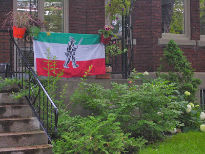 The flag in the photo is not the one I just put up on our balcony: it is one designed during the Rebellion and revived during by Quebec's nationalists in the late 20th century. I probably should go looking for one to fly on this holiday, but the nearest thing I have is the Quebec flag. I fly it largely as a reminder that the Patriotes included many Anglophones who had had enough with British dominance. Justice, democracy and responsible government go beyond linguistic barriers.