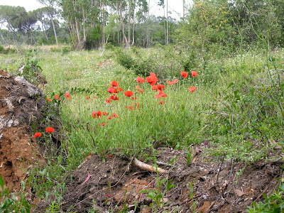 Today is Remembrance Day, but I'll not be wearing a red poppy. It's fine to honour the dead, but not to glorify war.So I'm posting here a picture I took last summer in Portugal. The poppies were growing in a field near the old Roman town of Conímbriga which was abandoned to attackers about 300 AD.