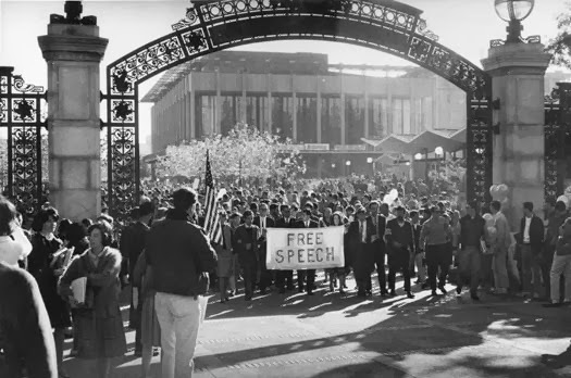 The photo, by the way, was taken almost 50 years ago during the Free Speech Movement: the crowd was marching off campus toward Telegraph Avenue. Long time ago.