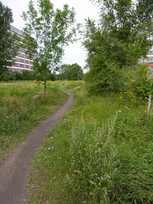 next month. It's appropriate, in a way, because this sinuous path crossing the Champ des possibles open space near where I live started me thinking about the resonances of "desire lines." They are, urbanists say, the paths people choose to make when they want to get some place. They frequently have nothing to do with formal layout of streets and sidewalks and almost always they say a lot about people's aims.